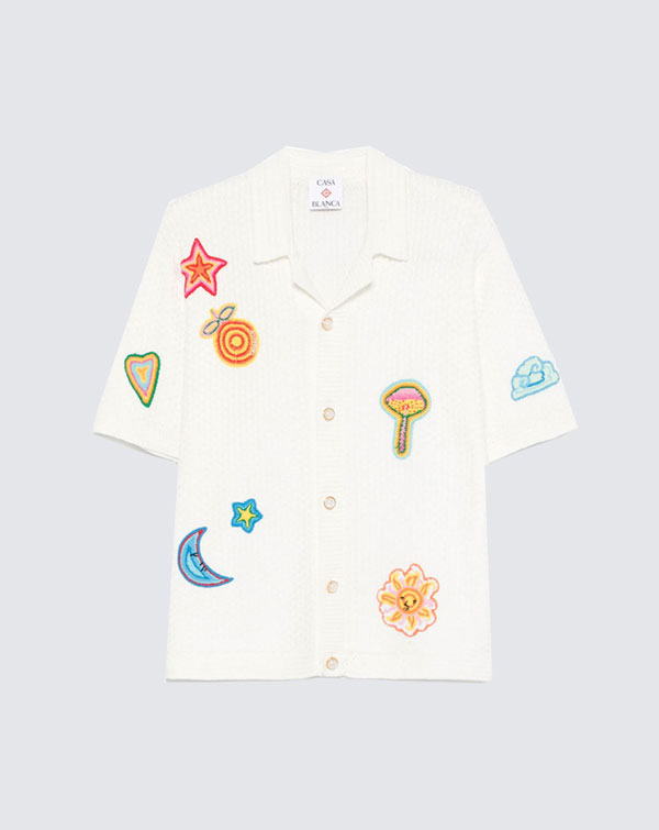 Graphic print at chest and back. Single pocket at chest. Straight point collar. Stripes at edges. Button closures at front.